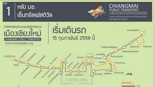 清迈市政府总共规划了14条公交线路(1到14路),目前已有5条线路(1、2、4、7、9路)率先投入使用。比较引人注目的是,这次市政府还在各公交站点竖立了新型的公交站牌,站牌上明确标示了经过该站点的公交线路,到达站点的明确时间,以及该线路所经停的所有站点等实用信息。