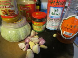 鸡腿4块、柠檬草切碎、2根大蒜、7瓣高良姜、2片胡椒、1茶匙白砂糖、3汤匙鱼露、2汤匙椰奶、3汤匙柠檬草