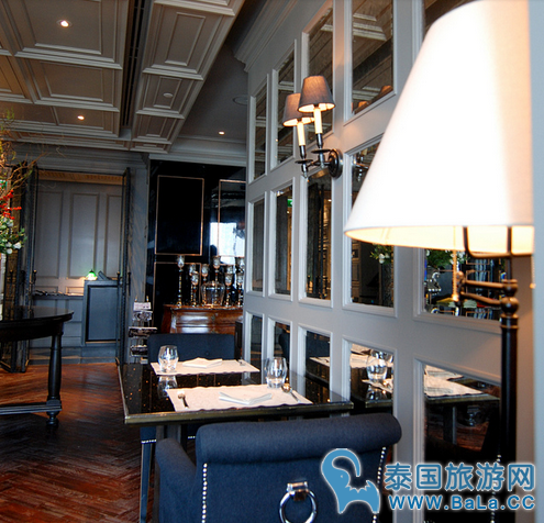 这间Su Tha Ros基本上提供的服务包含住房的早餐、一般午晚餐,当时我们前往消费时,还没有太多人知道这间餐厅,所以中午抵达时是第一组客人,服务人员马上引领我们前往就座,得以俯瞰曼谷市景的好位置。环顾餐厅四周,可以发现装潢同样走黑色贵族气派路线,从每一桌桌面使用黑色略带点金箔的石材,到椅子背后都有一个银色扣环,天花板到墙面都是精致刻花与一片片镜子,穿插着一束束的紫色桔梗桌花,只能再三的庆幸还好当初有规划来此用餐。