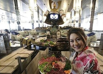 泰国曼谷有一家名为Hajime 的机器人餐馆,这是一个日本风味的主题餐厅。除了能做出Ni Hon 国的各种美味之外,此店打出的最大噱头,便是机器人。他们拥有4个武士造型的机器人服务员,通过座位旁边的触摸屏,就可以向他发出命令。不管是送餐还是清理餐桌,均随叫随到。